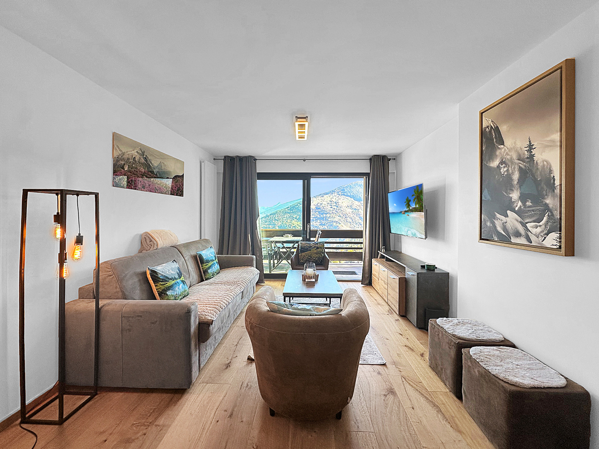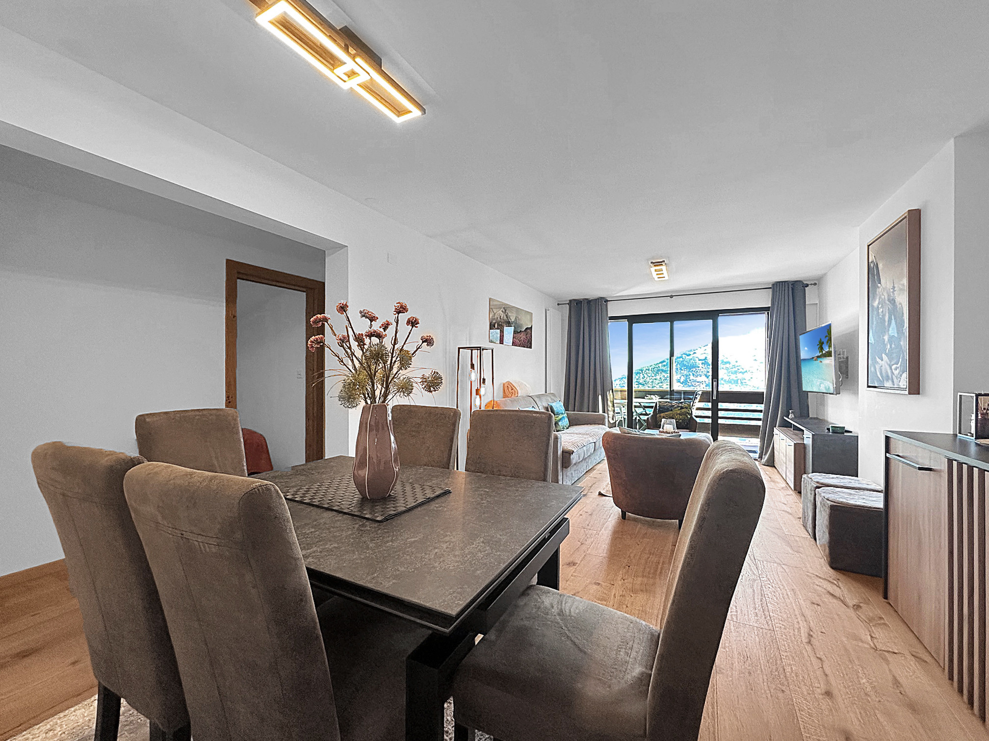Ideal gelegen nur wenige Schritte von den Liften, Geschäften, Restaurants und dem Treiben der Station entfernt, bietet Ihnen diese im Sommer 2024 vollständig renovierte Wohnung Komfort, Modernität und einen spektakulären Blick auf das Rhonetal und die Alpen.