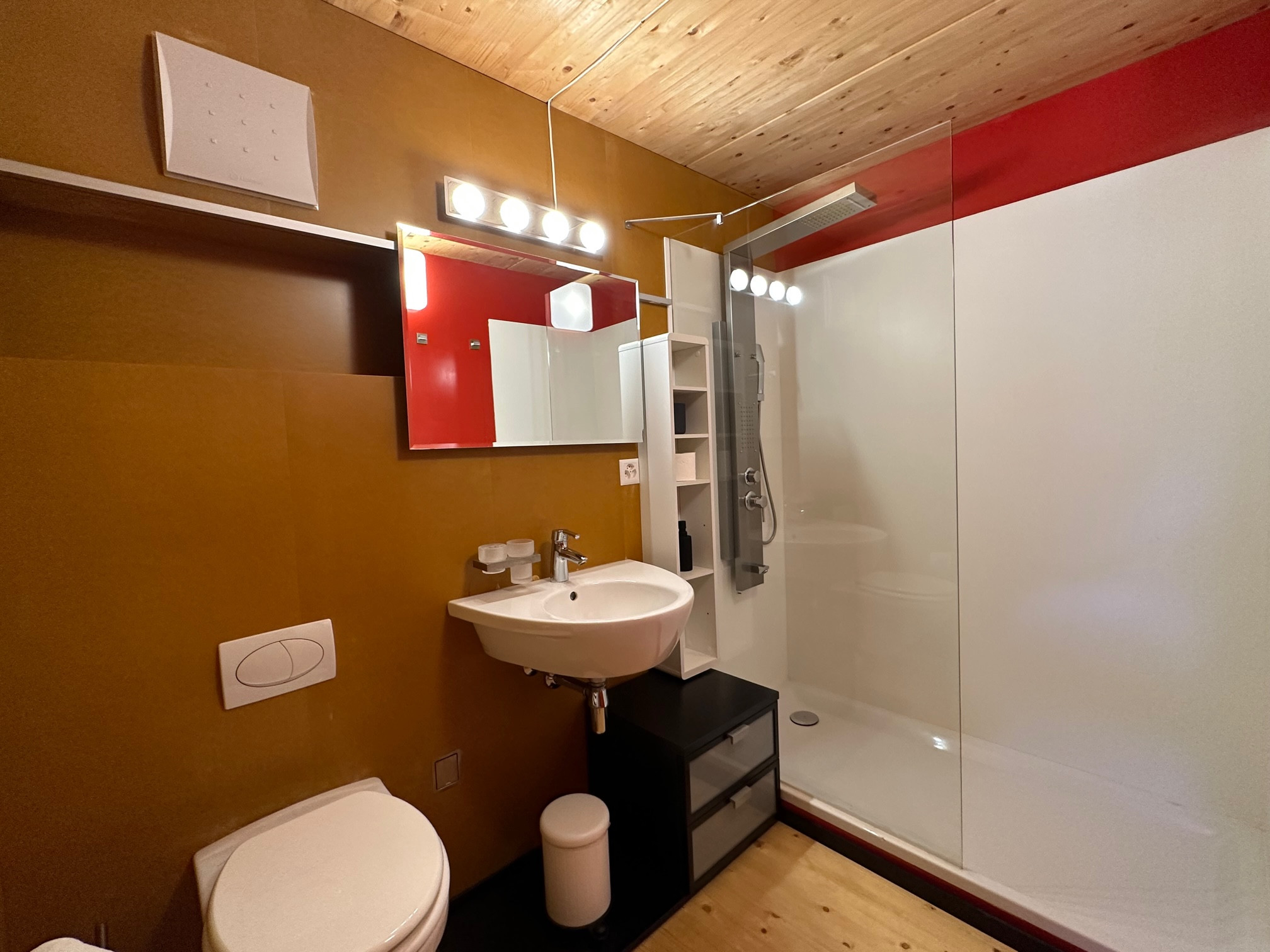 Diese Ebene bietet Ihnen außerdem ein Schlafzimmer mit einem 160x200 cm großen Doppelbett sowie ein Badezimmer mit WC.